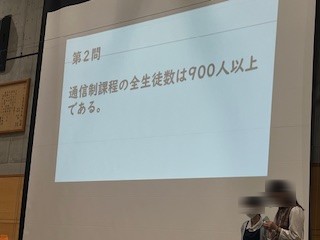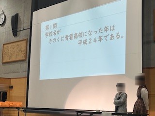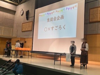 生徒会企画では、体育館で○×すごろくが行われました。学校にまつわるクイズが出題され、生徒の皆さんが一体となって盛り上がりました。