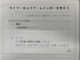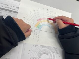 6限は進路講演会が開催され、若者サポートステーションわかやまより講師をお迎えし、「ライフ・キャリア・レインボーを作ろう」という演題でワークショップが行われました。
