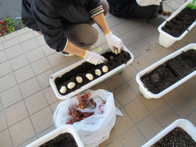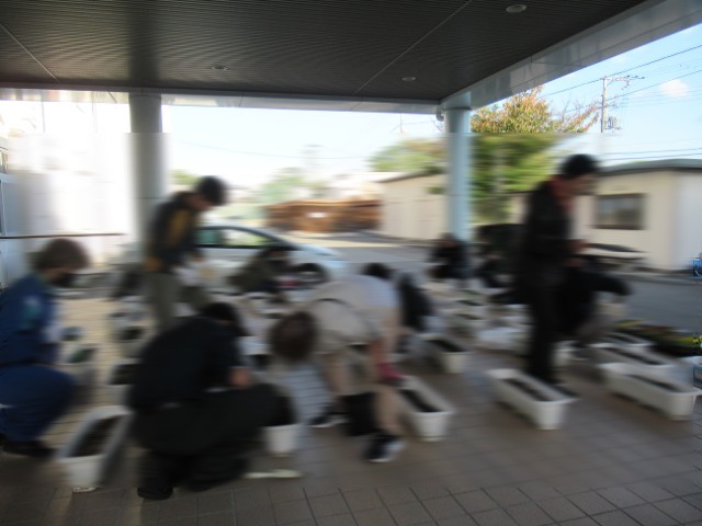 本日、チューリップの球根植えを行いました。1つのプランターに20個の球根を丁寧に植え、生徒たちは来春に咲く色とりどりの花を思い浮かべながら、一生懸命に作業に取り組みました。