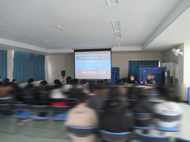 本日は非行防止教室として、和歌山県警察本部少年課の警察職員の方を講師にお迎えし、「犯罪と非行・特殊詐欺加担防止」や「スマートフォン・インターネットの危険性」をテーマにご講話いただきました。闇バイトやSNSをきっかけとした犯罪被害・加担の実例を交えながら、自分の生活や行動を振り返り、事件に巻き込まれないために注意すべき点や、犯罪にあたる行為、防犯に関する知識について、分かりやすく丁寧にお話しいただきました。